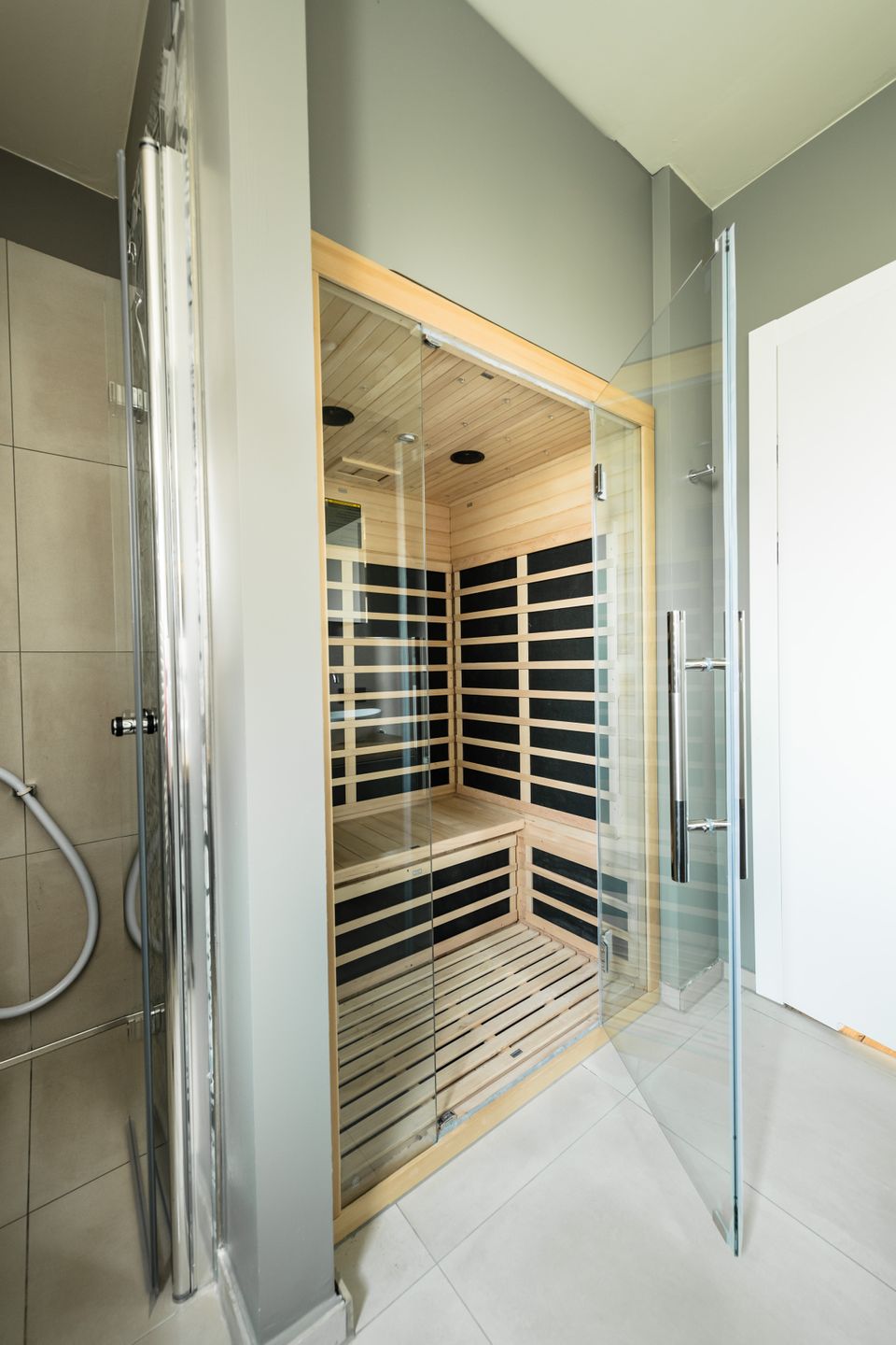 Das geräumige Badezimmer führt den Stil der Ferienwohnung fort und ist in warmen Naturtönen gehalten. Highlights sind die große ebenerdige Dusche und die Doppelwaschtische mit hochwertigen Amaturen und die eigene Infrarotkabine.
